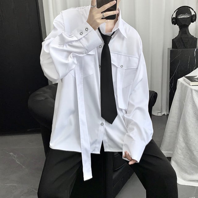カレッジスタイルのネクタイシャツメンズイントレンドダーク禁欲ルーズ長袖DK制服黒シャツ学生インチシャツ